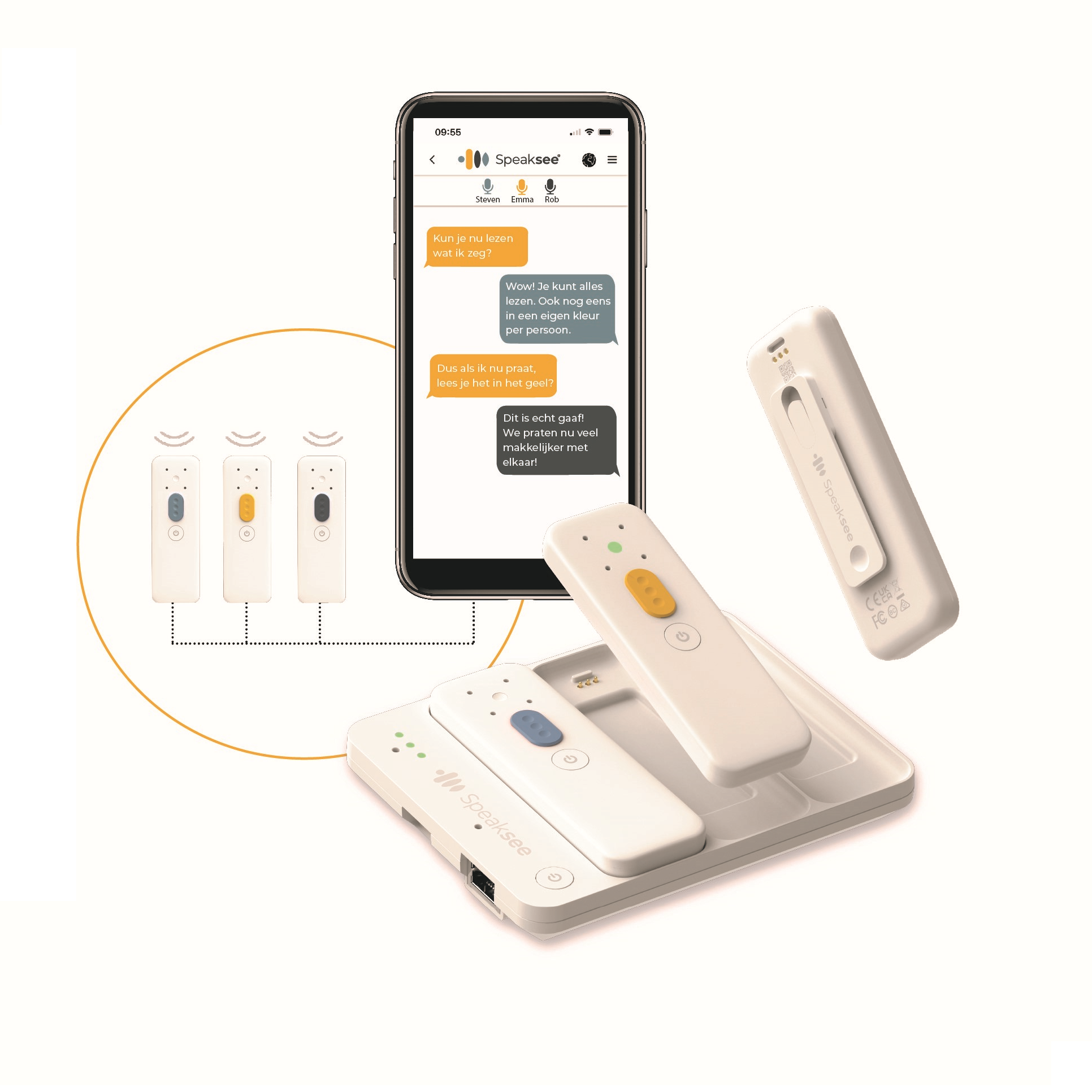 De verschillende microfoons (maximaal 9) vangen spraak op die de lezer direct op de smartphone, tablet of laptop ziet. Zij lezen direct wat er wordt gezegd.